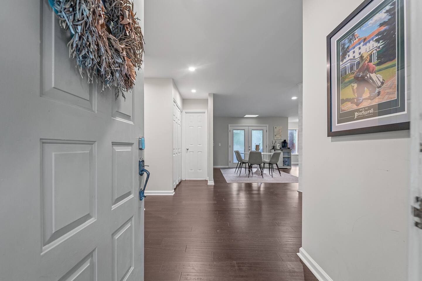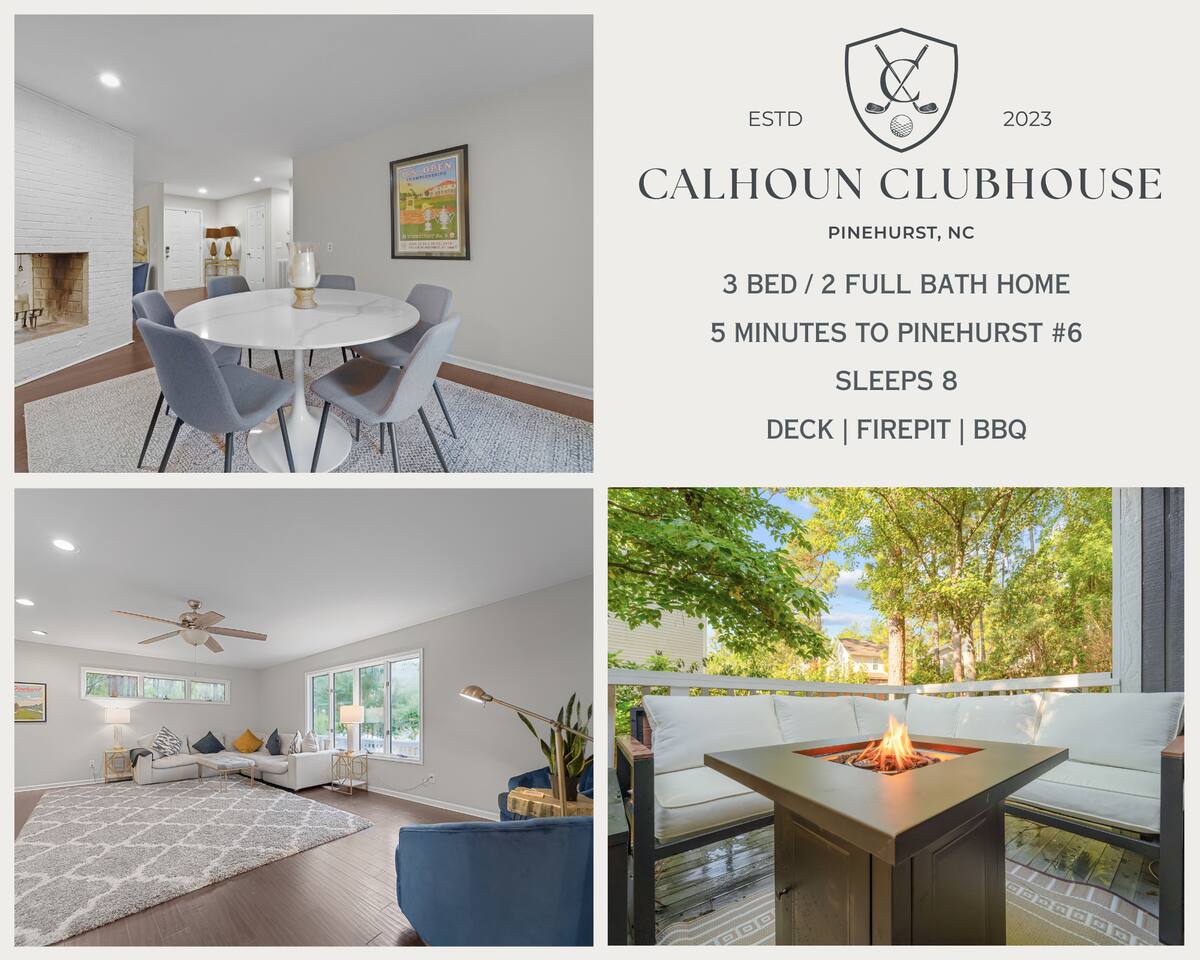CALHOUN CLUBHOUSE – 5 min to top courses! Fast WiFi, pet-friendly & a cozy deck make relaxing easy. 3 renovated bedrooms, sleeps 8 comfortably Fully stocked kitchen & grill for post-round meals Corner lot—perfect for pets and lawn games Parking for 4 and lightning-fast self-check-in Walk one minute to the Greenway trails or drive five to Pinehurst #6. Book now to unwind in clubhouse comfort!
